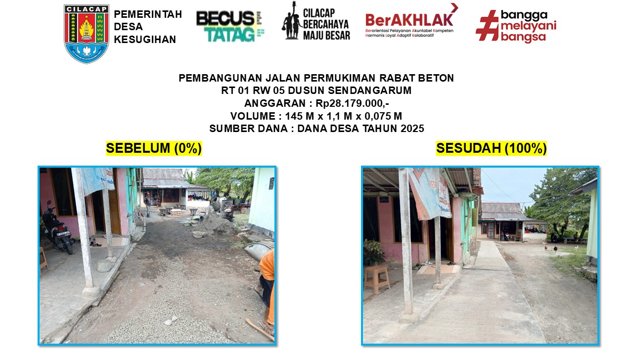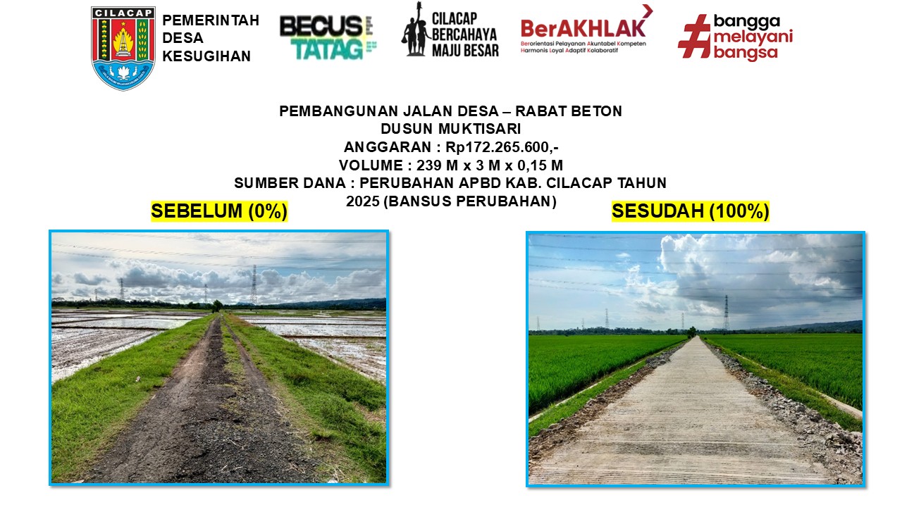 Melalui rekap ini, masyarakat dapat melihat secara terbuka progres, capaian, serta manfaat dari pembangunan yang telah direalisasikan demi mewujudkan Desa Kesugihan yang maju, mandiri, dan sejahtera. Berikut daftar Pembangunan yang dilaksanakan oleh Pemerintah Desa Kesugihan selama Tahun 2025 :