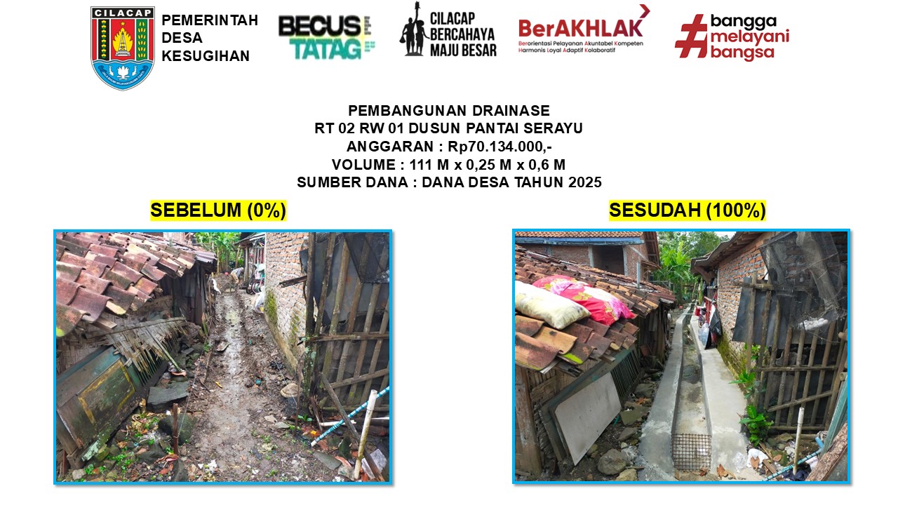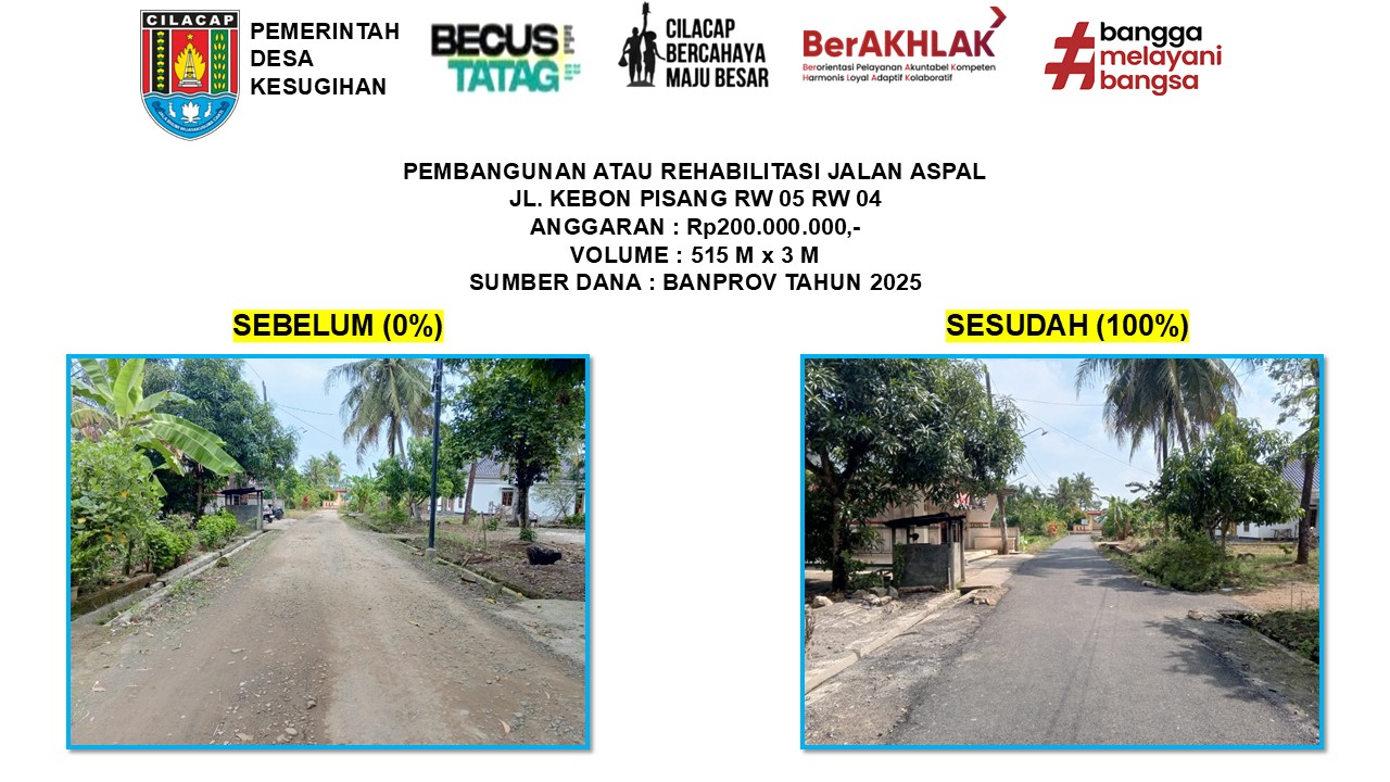 Sepanjang tahun 2025, Pemerintah Desa Kesugihan telah melaksanakan 14 kegiatan pembangunan sebagai wujud komitmen dalam meningkatkan kualitas infrastruktur, pelayanan, dan kesejahteraan masyarakat.