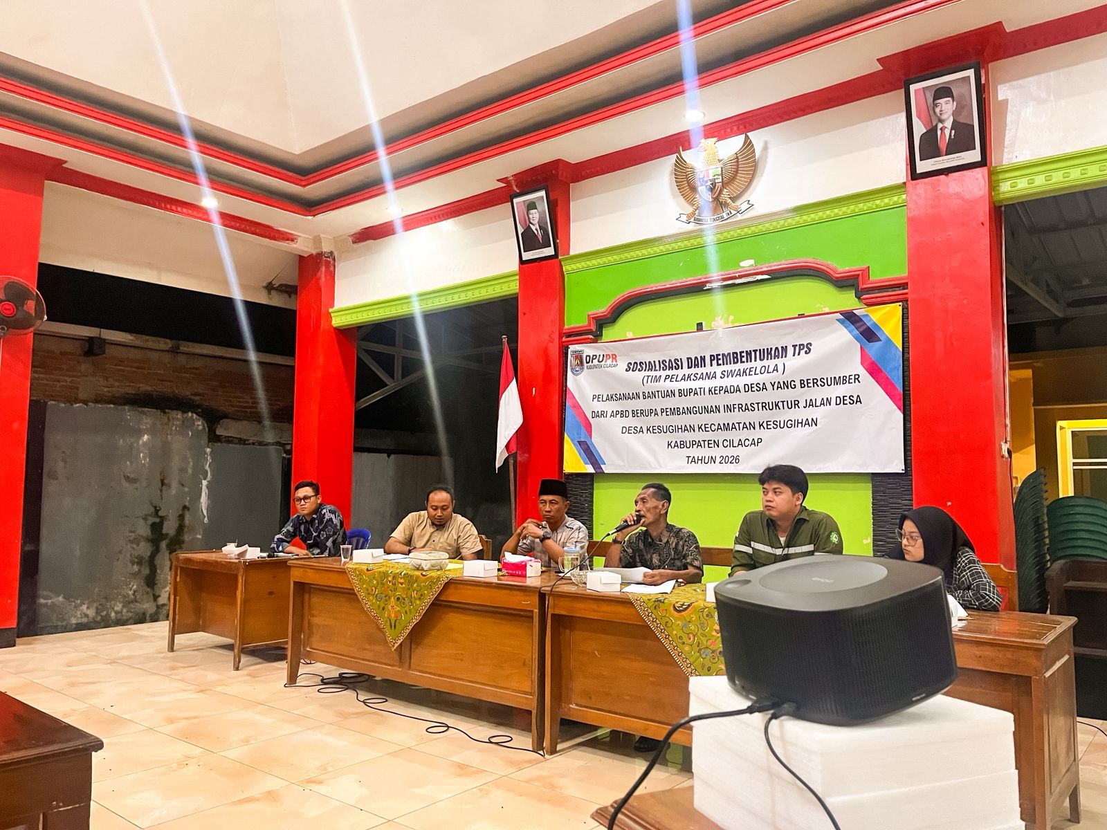 Kesugihan – Pada tanggal 31 Maret 2026, Pemerintah Desa Kesugihan menyelenggarakan kegiatan Sosialisasi dan Pembentukan Tim Pelaksana Swakelola (TPS) yang bertempat di Pendopo Balai Desa Kesugihan. Kegiatan ini merupakan bagian dari pelaksanaan program Bantuan Bupati kepada Desa yang bersumber dari Anggaran Pendapatan dan Belanja Daerah (APBD), khususnya untuk pembangunan infrastruktur jalan desa.